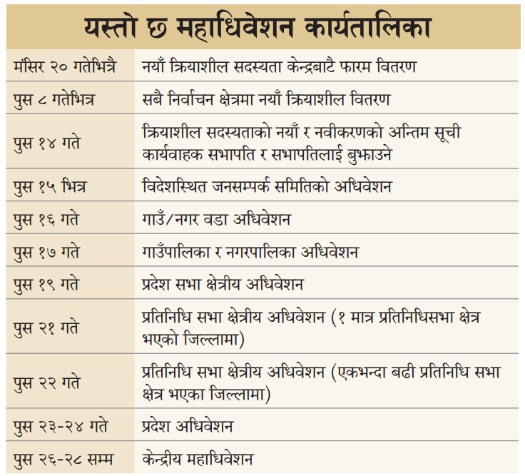 केन्द्रीय समितिले सोमबार प्रस्ताव गरेको २६– २८ पुसको महाधिवेशन मितिपूर्व पार्टीका विभिन्न संरचनाका लागि विभिन्न चरणमा प्रस्ताव गरिएको कार्यतालिका प्रथम दृष्टिमै अव्यावहारिक र अवैज्ञानिक देखिएको पनि उनीहरूको दाबी छ । उनीहरूले कुनै पनि बहाना वा अवस्थामा अधिवेशनका शृंखलाहरू अवरुद्ध गरिएमा वा भएमा असोज २९ गते दर्ता गरिएको विशेष महाधिवेशनको प्रस्ताव अघि बढ्ने ध्यानाकर्षण पनि गराएका छन् ।