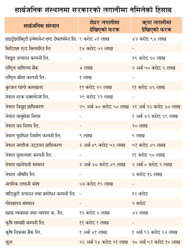 जलविद्युत् आयोजना, विमानस्थल निर्माण, दूरसञ्चार र खानेपानी जस्ता पूर्वाधार परियोजना सञ्चालन गर्ने भन्दै सार्वजनिक संस्थानमा सरकारले ऋण तथा शेयर लगानी गर्दै आएको छ । तर सार्वजनिक संस्थानमा आन्तरिक नियन्त्रण प्रणालीको अभाव र लेखाजोखासम्बन्धी एकीकृत मापदण्डसमेत नहुँदा नेपाल सरकारले गरेको शेयर तथा ऋण लगानीको यथार्थ आकलन हुन नसकेको हो । यही समस्यालाई सम्बोधन गर्न ‘शेयर तथा ऋण लगानी नीति, २०८१’ जारी गरिएको भए पनि यो नीति कार्यान्वयन हुनुभन्दा अगावैको हिसाब मिलानमा समस्या छ ।