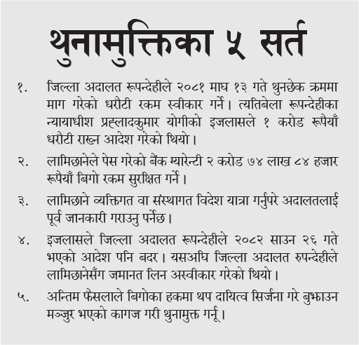 लामिछानेले आफू कार्यरत रहेको संस्थामा सुप्रिम सहकारीबाट रकम प्रवाह भएको बिगोमध्ये दामासाहीले हुने बिगो बैंक ग्यारेन्टी राखी मुलुकी फौजदारी कार्यविधि संहिता, २०७४ को दफा ७१ अनुसार बैंक ग्यारेन्टी लिई मुद्दाको पुर्पक्ष गरिपाऊँ भन्ने माग गर्दै निवेदन दिएको विषय आदेशमा पनि उल्लेख छ । उच्च अदालत तुलसीपुरको आदेशमा भनिएको छ, ‘प्रतिवादीले बिगोका हकमा दामासाहीले हुने रकम जमानत दिई बचतकर्ताको बिगो प्राप्त गर्ने सुनिश्चितता गरेको देखियो ।