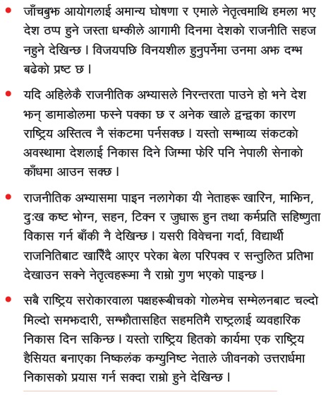 आउँदो फागुन २१ गते चुनाव होला नहोला, यो कुरा आफ्नै ठाउँमा छ । तर बदनाम सिण्डिकेटधारी ‘तीन प्लस’ नेताहरू चुनावका लागि सल्बलाउन भने थालिसकेका छन् । यिनीहरूको अनुहार र चरित्रबाट वाक्कदिक्क भएका आमजनता अहिलेको सरकारको काम कारबाहीबाट पनि सन्तुष्ट छैनन् । चुनाव भए वा नभए वा अदालतले विघठित संसद्लाई पुनस्र्थापना गरे पनि देशले अझ सास्ती बेहोर्नुपर्ने कुरा पक्कापक्की छ भने उपरोक्त कुनै पनि विकल्पले निकास दिने सम्भावना नै देखिँदैन । अब प्रश्न उठ्छ, अहिलेको अवस्थामा निकास कसले दिन सक्छ त ?