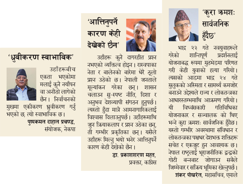 ७ बुँदे सहमति गरेर चुनावका लागि वैकल्पिक शक्तिको धु्रवीकरणलाई बल दिएका बालेन र रविले कुलमानलाई सहमतिमा ल्याउन संवाद छाडेका छैनन् । समाचार तयार पार्दासम्म तीन नेताबीच संवाद भइरहेको छ । सोमबार बिहानसम्म सम्भवतः धु्रवीकरणको नयाँ अध्याय थपिने सम्भावना छ । उज्यालो नेपाल पार्टीका केन्द्रीय सदस्य केदार खड्काले शनिबार बसेको पार्टी केन्द्रीय समिति बैठकले सबैसँग सहकार्यका लागि ढोका खुल्ला राख्ने निर्णय गरेको सुनाए । ‘प्रगतिशील सोच भएका राष्ट्रिय र क्षेत्रीय पार्टीहरू, विभिन्न क्षेत्रमा नाम कमाएका मानिसहरू र अरु स्वतन्त्र व्यक्तिहरू पनि संवादमा हुनुहुन्छ,’ खड्काले भने,‘रास्वपासँग पनि सहकार्यको सबै ढोका बन्द भइसकेको छैन । पार्टी एकता नभएपनि चुनावी तालमेल हुनसक्छ ।’