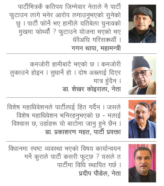 महामन्त्रीहरूले विशेष महाधिवेशन घोषणा गरेपछि कांग्रेस विभाजनको चर्चा शुरु भएको छ । संस्थापनपक्षधरले विशेष महाधिवेशन गरेर पार्टी फुटाउन खोजेको आरोप लगाइरहँदा पक्षधर भने त्यस्तो आरोप अस्विकार गर्छन् । महामन्त्री गगन थापा विशेष महाधिवेशन फुटाउन होइन जुटाउनका लागि आयोजना गरिएको बताउँछन् । ‘पार्टीभित्रकै कतिपय जिम्मेवार नेताले नै पार्टी फुटाउन लागे भनेर आरोप लगाउनुभएको सुनेको छु। पार्टी फोर्ने भए हामीले यतिबेला चुनावको मुखमा फोथ्र्यौँ ? फुटाउने योजना भएको भए धेरैअघि गरिसक्थ्यौ,’ उनले भने, ‘हामीसँग नयाँ पार्टी दर्ता गर्ने सुविधा पहिले थियो, अहिले छैन । सुविधा भएका बेलामा हामीले विशेष अधिवेशन कात्तिकमै बोलाएर फुटाउन सकिन्थ्यो । तर हामीले पार्टी फुटाउन चाहेकै होइनौँ ।’ अर्का नेता प्रदीप पौडेल पनि विशेष महाधिवेशनले पार्टी फुटाउने नभई विधि स्थापित गर्ने दाबी गर्छन् । ‘विधानमा स्पष्ट व्यवस्था भएको विषय कार्यान्वयन गर्ने कुराले पार्टी कसरी फुट्छ ? यसले त पार्टीमा विधि स्थापित गर्छ,’ नेता पौडेलले भने ।