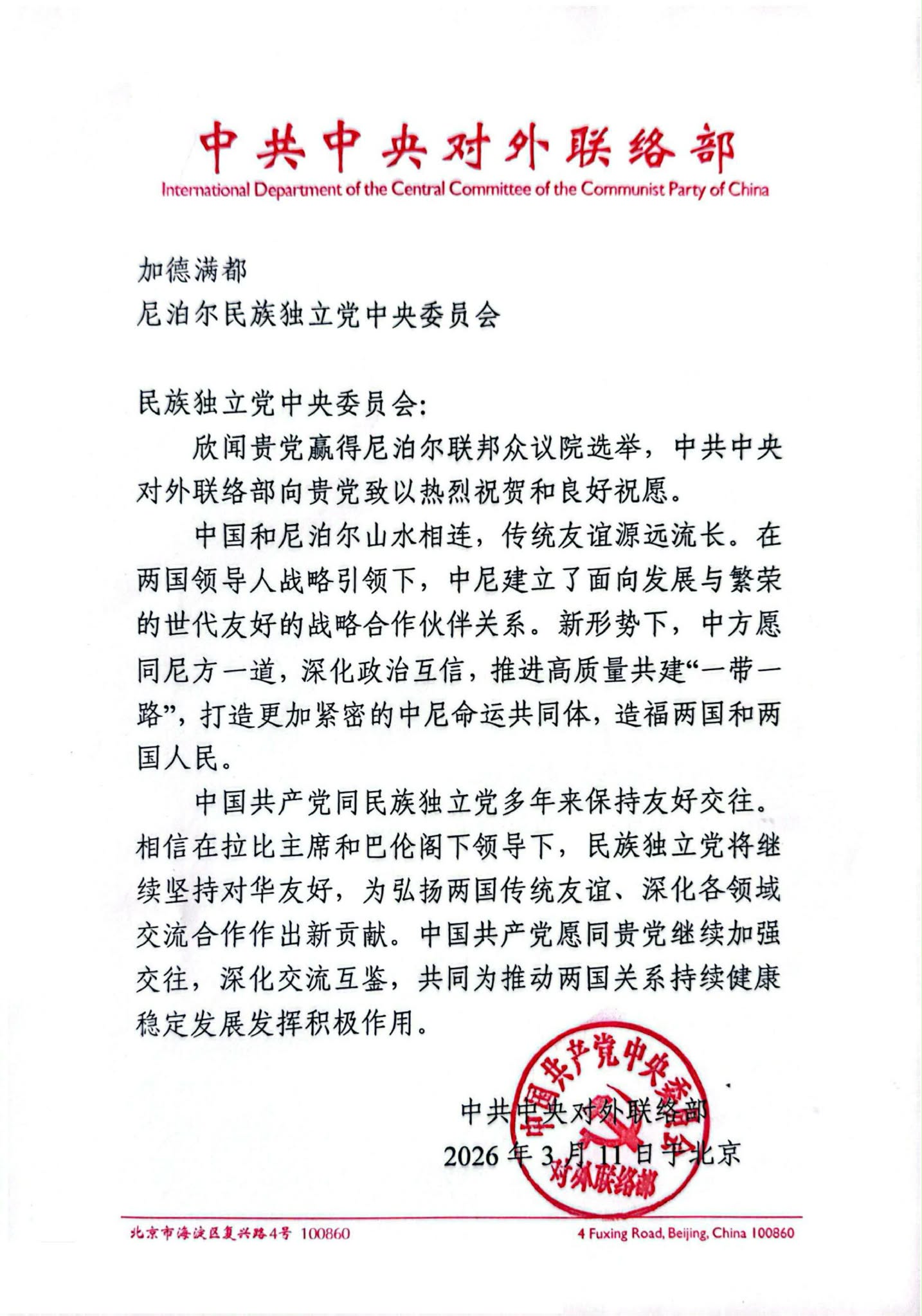 सीपीसीले शुभकामना सन्देश पठाएर रास्वपा नेतृत्वको सरकारसँग चीनले मैत्रीपूर्ण सम्बन्ध कायम राख्ने र सहकार्यलाई गहिरो बनाउने जनाएको छ ।